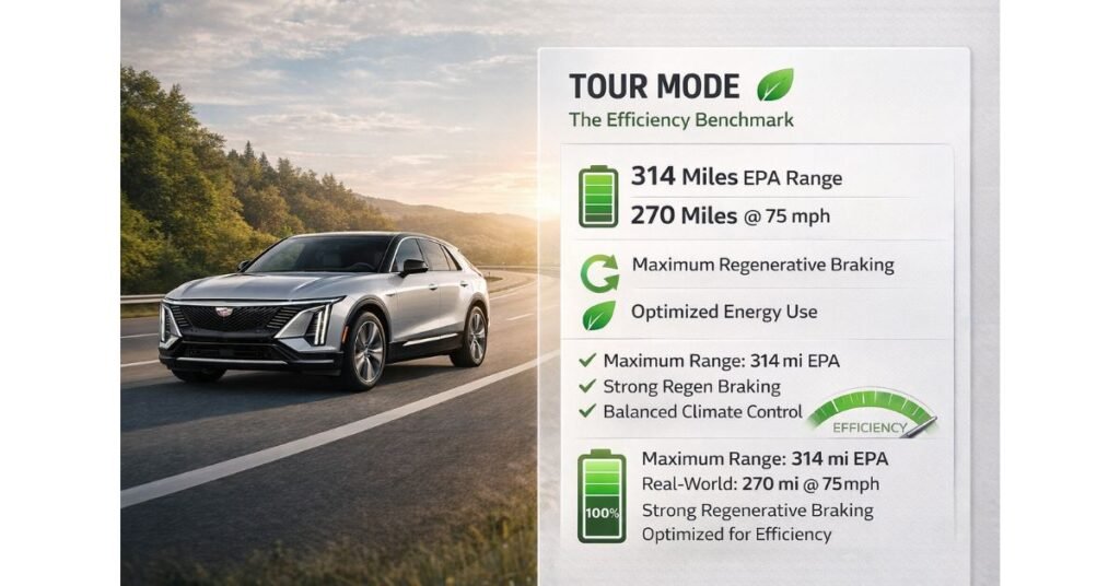 In real-world testing, Tour Mode delivers results closest to EPA estimates. Car and Driver’s 75-mph highway range test achieved approximately 270 miles in the RWD Lyriq using Tour Mode—impressive considering highway driving typically reduces EV range compared to city driving. The strong regenerative braking in Tour Mode proves particularly beneficial in urban environments, where frequent deceleration allows substantial energy recapture.